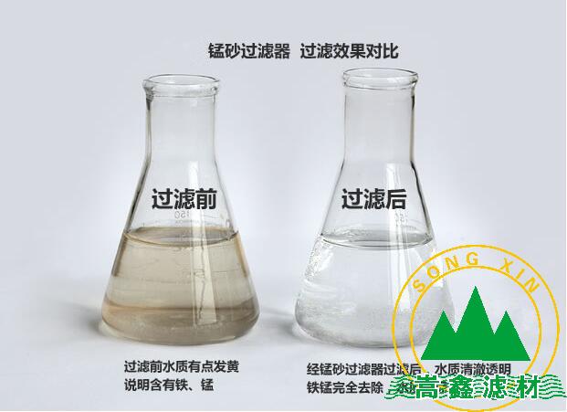 天然錳砂濾料是一種良好的天然氧化劑,它能有效的將水中二氧化錳能氧化水中二價(jià)鐵為三價(jià)鐵使其沉淀除去,二氧化錳被水中的溶解氧氧化成七價(jià)錳的氧化物。用于地下水除鐵和除錳的天然錳砂濾料,其錳的形態(tài)應(yīng)以氧化錳為主。含錳量(以MnO2計(jì),下同)不應(yīng)小于35%的天然錳砂濾料,既可用于地下水除鐵,又可用于地下水除錳;含錳量為20%~30%的天然錳砂濾料,只宜用于地下水除鐵;含錳量小于20%的錳礦砂則不宜采用。宜優(yōu)先采用經(jīng)過科學(xué)試驗(yàn)或生產(chǎn)使用證明能獲得良好除鐵和除錳效果的天然錳砂品種作濾料。