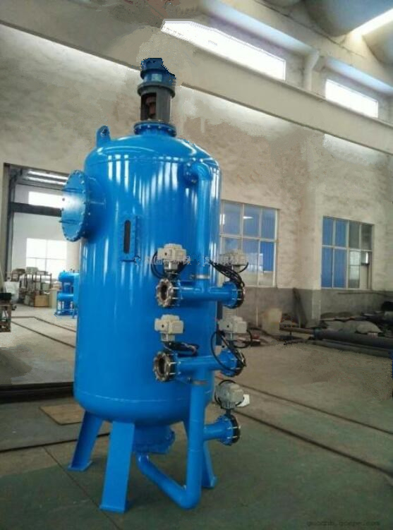 該型過濾器過濾時濾液高進(jìn)低出,反洗時反洗 水低進(jìn)高出,反洗水不間斷,清水消耗量大;攪拌 槳葉采用標(biāo)準(zhǔn)直葉片或斜葉片,對濾料傷害大,槳 葉一般不反轉(zhuǎn),使纖維球和水流同向旋轉(zhuǎn)運(yùn)動,導(dǎo)致反洗水對濾料沖洗力不大,濾料不易洗凈。