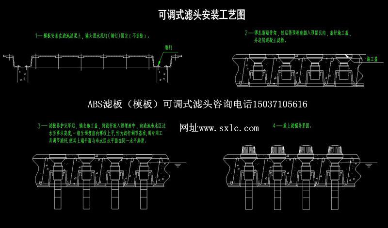 水廠濾池氣水反沖洗濾池常用的濾板有預(yù)制濾板和現(xiàn)澆整體濾板兩種:濾頭分為固定式和可調(diào)式兩種.固定式適應(yīng)于預(yù)制濾板:可調(diào)式長(zhǎng)柄濾頭特別適應(yīng)于現(xiàn)澆濾板.也適應(yīng)于預(yù)制濾板.QSK-ll型可調(diào)式長(zhǎng)柄濾頭原料采用高強(qiáng)度ABS顆粒樹脂(簡(jiǎn)稱ABS工程塑料)經(jīng)高溫?zé)崛苡删苣ゾ叱尚。可調(diào)式濾頭主要用:濾帽、濾桿、預(yù)埋座組成,濾桿上設(shè)有調(diào)節(jié)螺紋,可供上下調(diào)節(jié);且設(shè)有調(diào)節(jié)瓣與預(yù)埋座內(nèi)調(diào)節(jié)瓣防脫條結(jié)合,可控制濾桿調(diào)節(jié)精度,同時(shí)固定其位置。